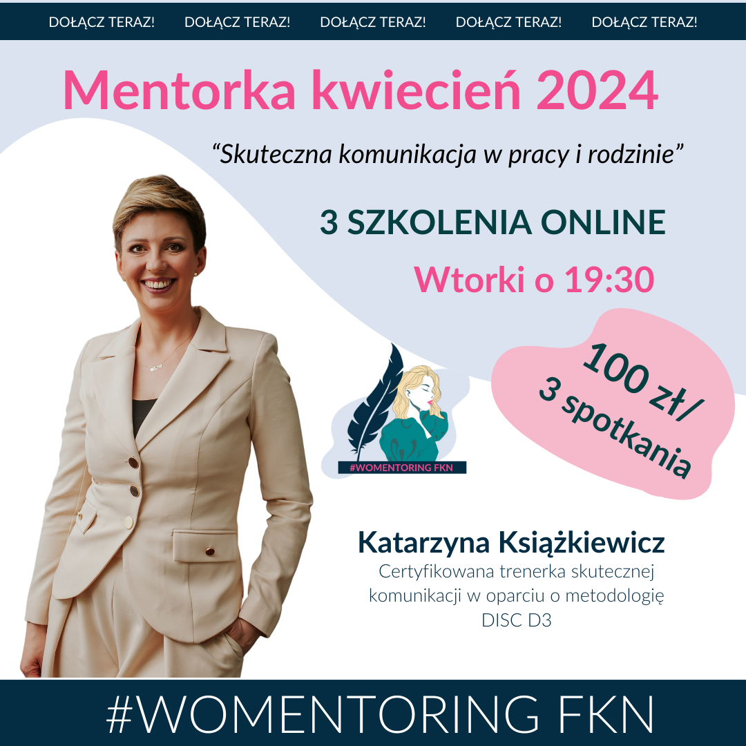 Przeczytaj program kwietniowej sesji mentorskiej w ramach projektu rozwojowego Womentoring FKN. Spotykamy się 3 x w miesiącu w terminach: 02, 09 i 30 kwietnia 2024 r., o godz. 19:30. Sesje mentorskie odbywają się na platformie Zoom i trwają ok. 90 minut. Tematy, jakie przygotowała dla Ciebie mentorka w kwietniu, to: