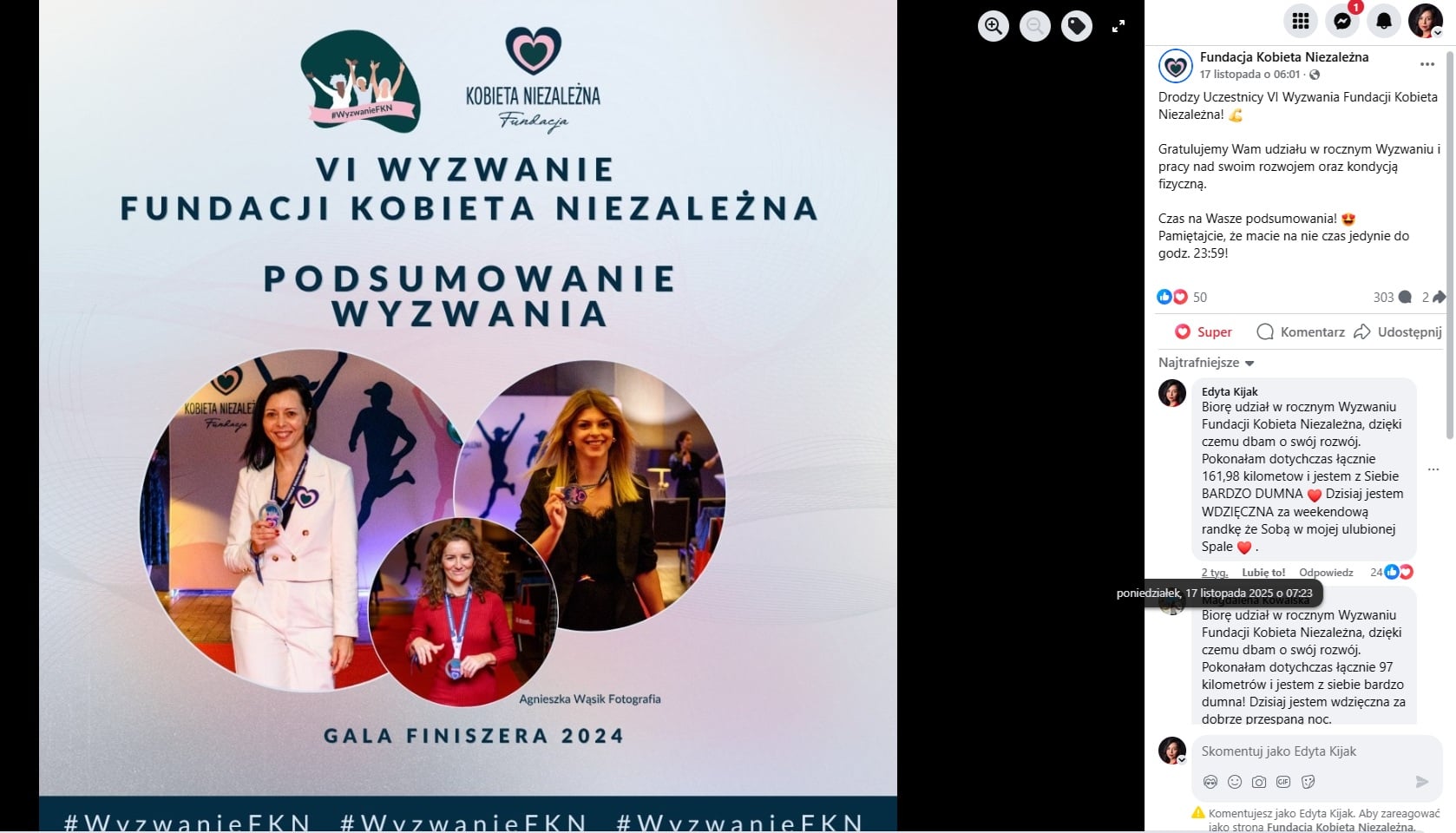 15 stycznia 2026 r. przed 8.00 rano pojawi się na fanpage’u Fundacji Kobieta Niezależna post ze zdjęciem i sygnałem do wpisania komentarza, w którym podzielisz się nagrodą jaką przyznasz sobie za ukończenie 2 etapu Wyzwania FKN. Masz czas do godziny 23:59 tego samego dnia, aby pod postem umieścić komentarz o treści: